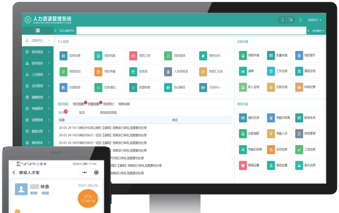 平台基于 HTML5 标准 + Java 开源技术栈研发的人力资源管理系统,它不仅适配 Windows、Linux 等主流系统,还能在 PC、苹果电脑、智能手机、iPad 等多终端设备及各类浏览器上流畅运行,实现全场景跨端访问。系统覆盖了员工自助平台的全流程功能:个人信息(档案、薪资、绩效等)、自助申请(请假、证明开具等)、常用功能(通讯录、考勤管理等)一应俱全,还能实时推送待办流程(如图中显示的请假审批提醒),既具备先进技术架构的兼容性与稳定性,也通过一站式功能布局,满足了企业人力资源管理的便捷化、移动化需求