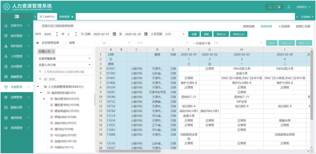 灵活的考勤配置与休假管理,实现考勤过程可视化管理和移动化应用;灵活的考勤方案,促进考勤制度有效落实;类Excel操作的矩阵排班,满足各科室排班需要灵活的请休假流程控制,确保员工利益和单位利益得到保障;月结果根据公式自动汇总,通过流程进行审核控制;支持移动端定位打卡,个人考勤信息查询,科室排班、出勤情况。