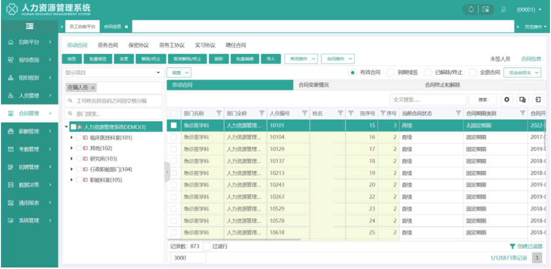 根据医院不同用工类型预置不同合同模板;规范合同标准,对各类人员合同的全面规范化管理;支持合同批量处理,大幅减少人力资源管理工作人员工作量;支持合同台账管理,便于查询统计合同签订总体状况;智能合同预警,降低合同执行风险。