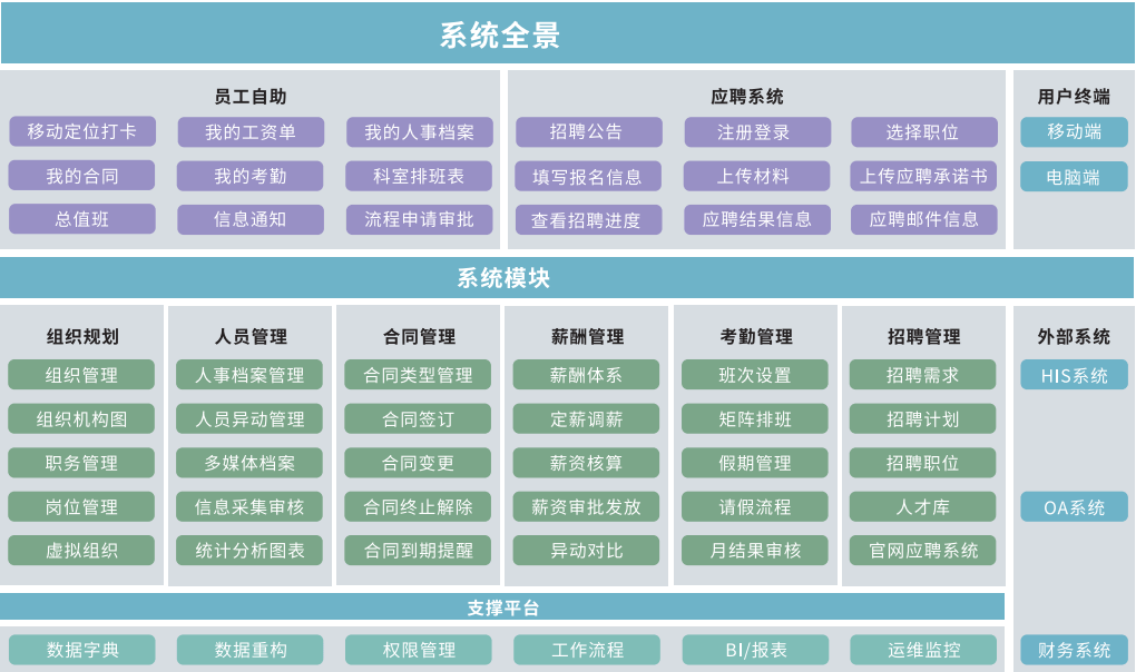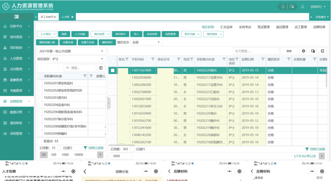 招聘需求,招聘计划,招聘职位管理,满足实际招聘需要,构建医院招聘门户,应聘人员线上注册填写报名材料;形成人才库,人事筛选简历、发送各种通知;支持不同岗位类别不同的面试、笔试、终面、试工、录取流程:应聘人员可通过移动端扫码注册填写报名材料。