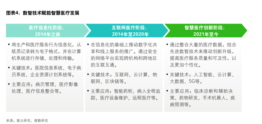 为提升医疗服务的可及性和公平性,国家陆续出台多项政策推动医疗信息化转型升级,智慧医疗发展可分为三个清晰阶段: